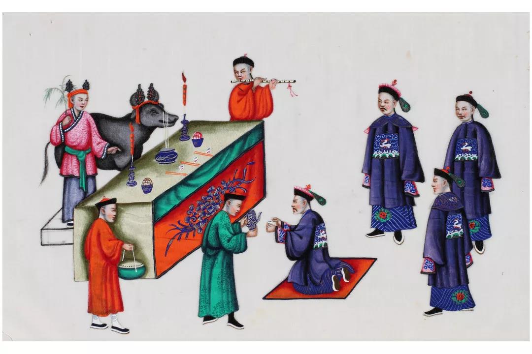从宋朝至清朝,鞭春牛一向为地方官府主持的活动。从馆藏的通草水彩《春祭图》中可以了解到,古人在对待春耕伊始的仪式是非常重视的。