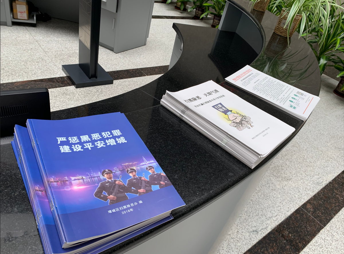 在城市馆服务大厅前台摆放扫黑除恶宣传单张及小册子现场