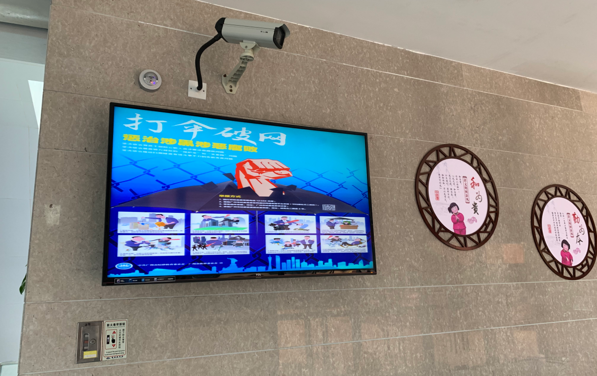 在区城市馆各楼层多媒体显示屏播放扫黑除恶宣传片现场