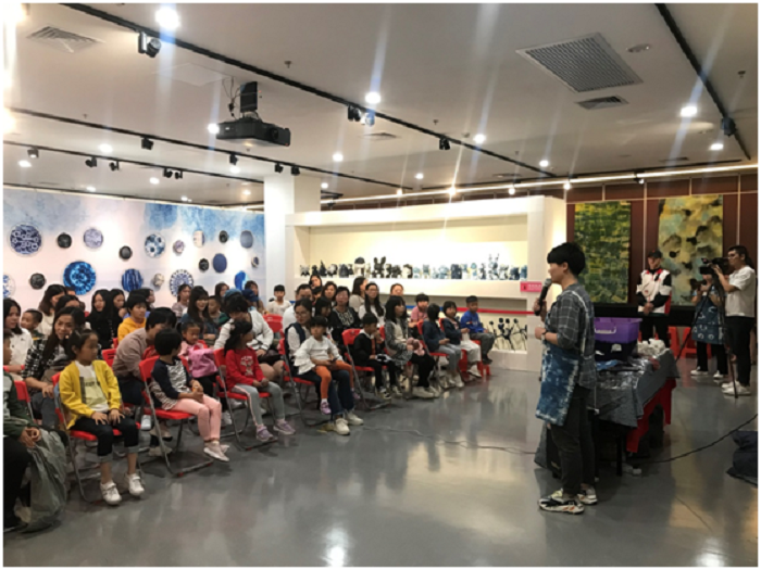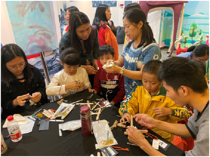 在讲座之后还安排了扎染手工活动,让观众能亲自体验扎染工艺的乐趣。在实践活动中,老师善于鼓励观众们主动提出问题,并引导他们解决问题,这不仅能够提高观众对这门传统手艺的兴趣,还能提高他们的动手能力、观察能力以及创造新思维的能力。