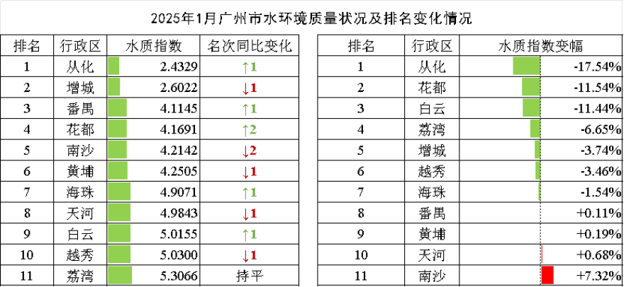 2025年1月,按照水质指数由低到高排名,各区地表水环境水质指数排名前三名为从化区、快三官网 、番禺区,后三名(从倒数第1名至倒数第3名)为荔湾区、越秀区、白云区。7个区水环境质量同比有所改善,其中从化区、花都区、白云区水质改善幅度均超过10%。