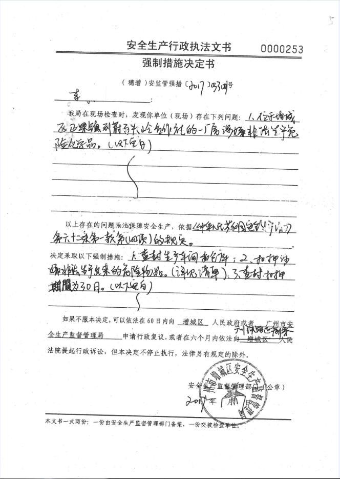 强制措施决定书(穗增安监管强措〔2017〕033001号)