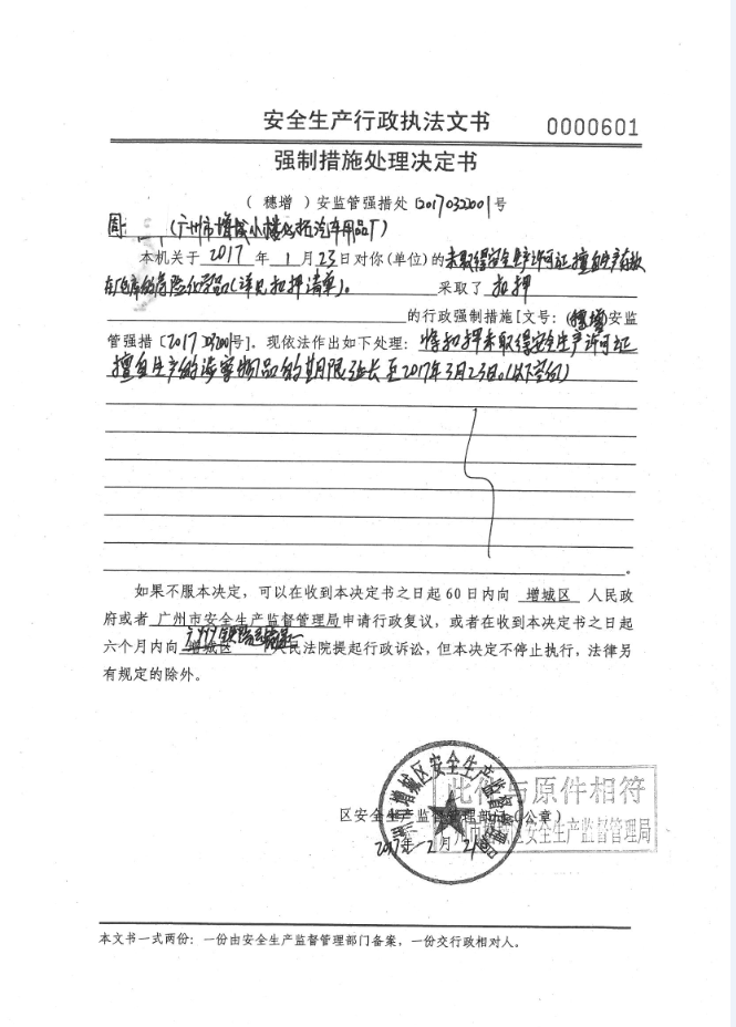 强制措施处理决定书(穗增安监管强措处〔2017〕032001号)