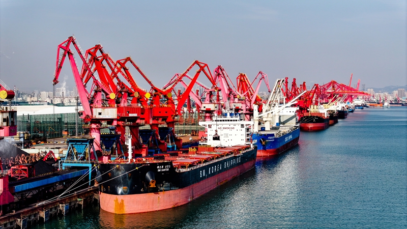 在山东港口日照港煤炭泊位,货轮停泊卸煤(2024年12月4日摄,无人机照片)。