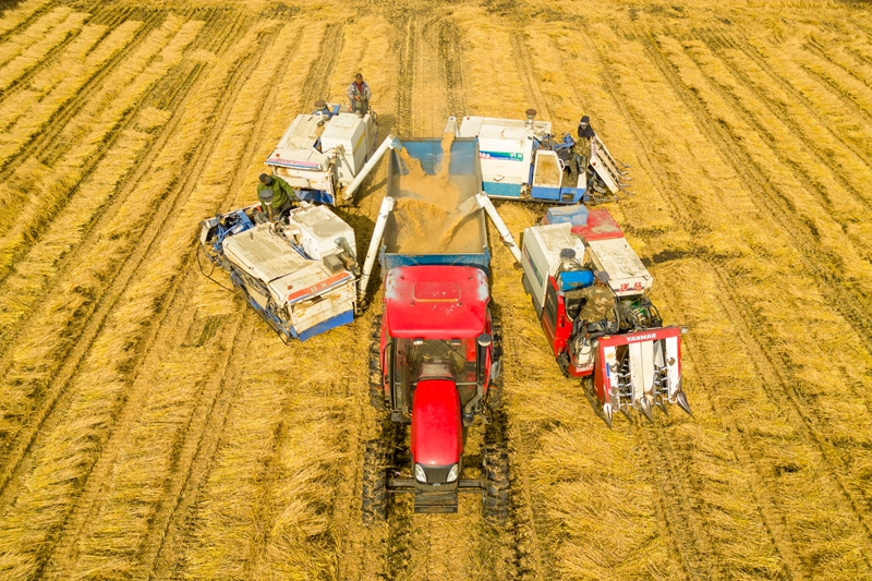 在黑龙江省绥化市北林区双河镇,村民驾驶收割机进行卸粮作业(2024年10月13日摄,无人机照片)。
