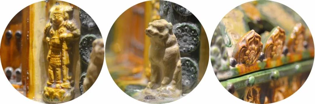 三彩琉璃舍利匣局部:天王、蹲狮等