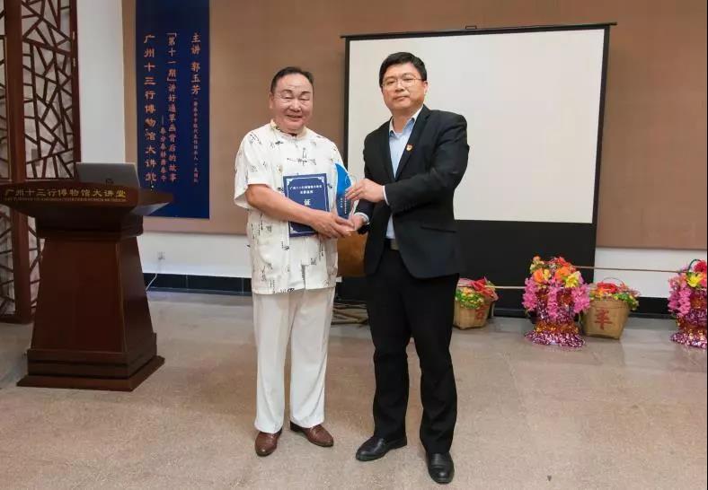 广州十三行博物馆副馆长王震(右)为郭玉芳颁发讲课纪念证书和奖座