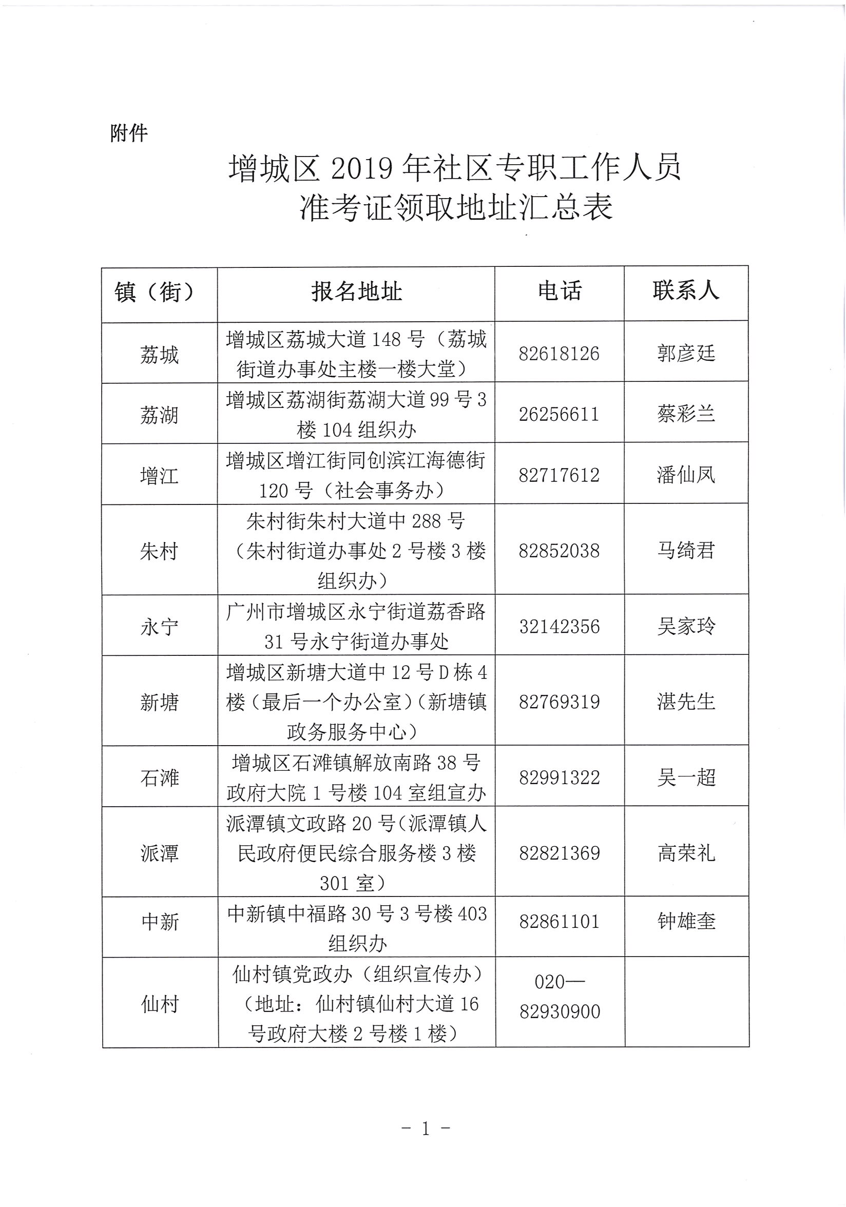 附件1:快三官网 2019年社区专职工作人员主考证领取地址汇总表(如下)