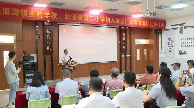 派潭镇实验学校、派潭镇第二小学正式纳入增城广附教育集团。活动现场,与会人员共同观看了广大附中增城实验中学的宣传片。随后,增城广附教育集团负责人向派潭镇实验学校、派潭镇第二小学授予“增城广附教育集团”牌匾,并举行揭牌仪式。